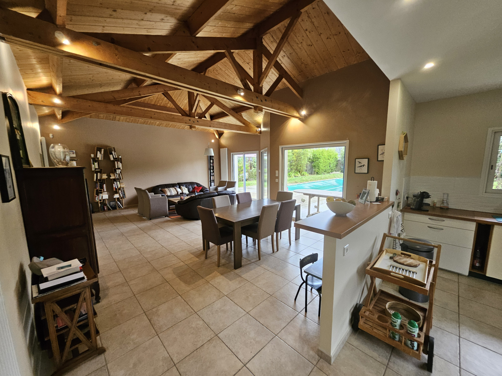 Proche commodités, aérodrome , commerces et 4 voies ; grande maison avec piscine en parfait état (177m² hab et 56m² d'annexes) permettant une vie de plain pied (isolée en grande partie exterieurement) présentant de beaux volumes de 1975 comprenant au rdc: une grande entrée avec placard, grande pièce de vie très lumineuse (avec baies) avec cuisine a/e ouverte de 61 m², une chambre de 10 m², sde, wc, buanderie débarras de 17 m², garage de 27 m², cave; au 1er: 4 chambres de 9 à 15 m² avec placards, sdb, wc, dressing; terrain de 1000m² en tout avec piscine filtrée, chauffée et sécurisée de 4 m par 10m (chauffage gaz de ville, ouvertures pvc double vitrage et aluminium, volets roulants ..).